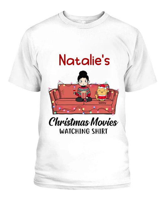 Christmas Movie Watching Girl And Cat Personalized Graphic Apparel - Girl, Cats and Names can be customized