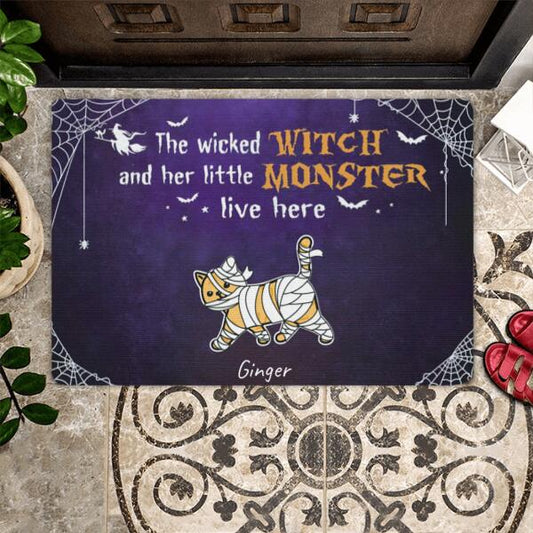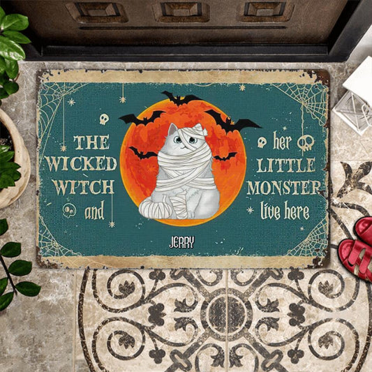 Wicked Witch And Monster Cats Live Here Halloween Personalized Doormat - Cats and Names can be customized